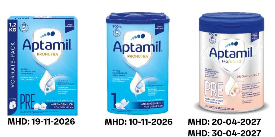 "Der in Abstimmung mit den österreichischen Behörden durchgeführte Rückruf betrifft ausschließlich die vier oben genannten Produkte mit dem spezifisch aufgeführten Mindesthaltbarkeitsdatum. Keine anderen auf dem österreichischen Markt erhältlichen Aptamil Produkte fallen unter diesen Rückruf.